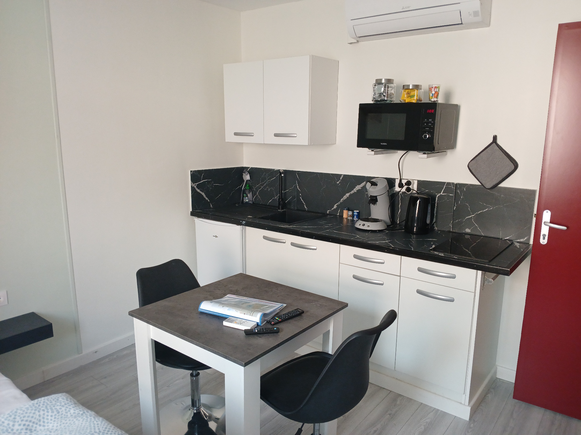 Nos t2 disposent d'un équipement de cuisine complet, d'une chambre avec un lit double confortable et d'une salle de bain avec wc.